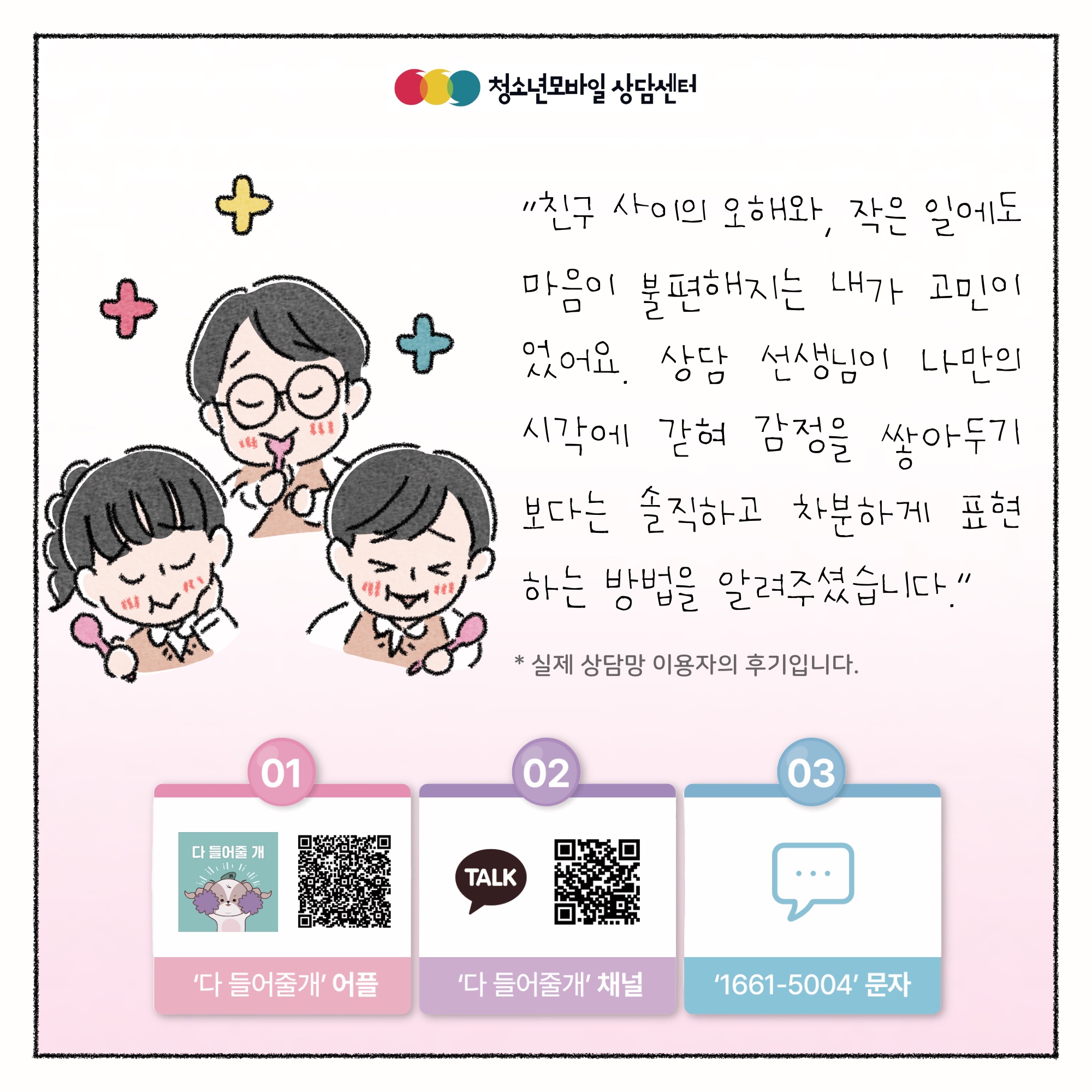 청소년모바일상담센터에서 제작한 청소년 정신건강 관련 웹툰을 볼 수 있습니다.